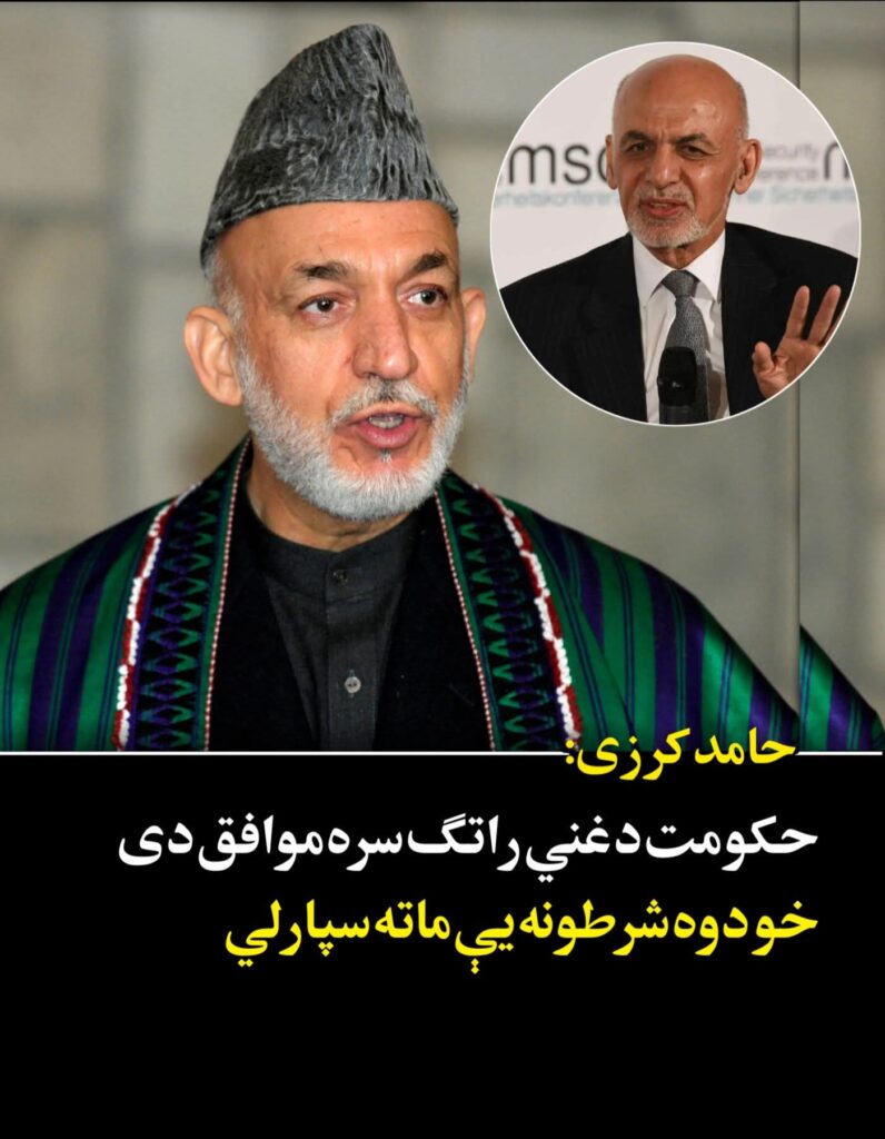 حامد کرزی: حکومت د پخواني ولسمشر اشرف غني له راتګ سره موافق دی نو دوه شرطونه یې ماته سپارلي